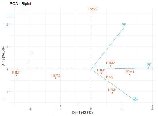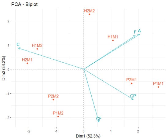 A biplot is a graphical representation of an N × M matrix, where N is the number of individuals [29] and M is the number of variables [30]. Its graphic structure allows for the analysis of data with more than one variable. Multivariate analysis reduces the dimensionality of a data set by projecting the data onto a lower-dimensional space called Euclidean space. Biplots provide a functional tool that can represent the results of a principal component analysis (PCA), displaying values and statistical products such as the distances between data units, their corresponding groupings, variance, and correlations between variables or between individuals [31].