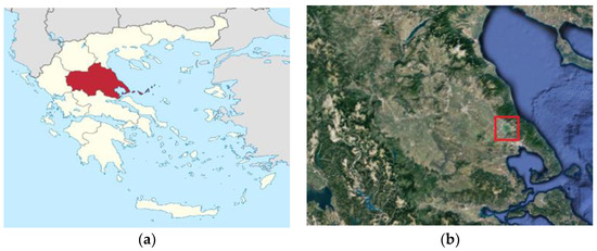(a) Location of Thessaly region (Wikipedia); (b) Geophysical map of Thessaly (Google Earth). The dark green area inside the red square indicates Lake Karla.