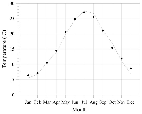 Monthly average value of temperature. Solid line: simulated values for the reference period; black circles: values referring to the TMY.