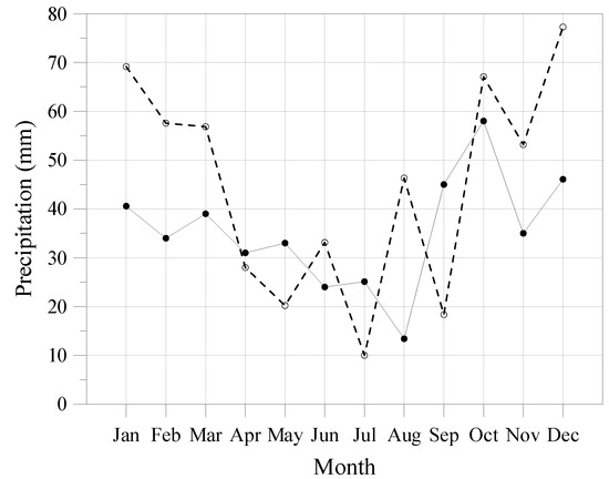 Monthly total precipitation. Solid line with black circles: simulated values for the reference period; dashed line with white circles: values referring to the TMY.