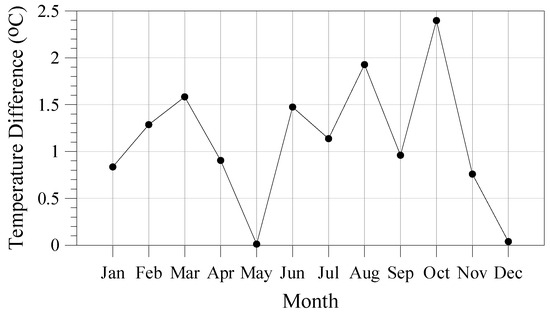 Figure 4 shows the differences in the monthly average values of temperature between the indicative future and the indicative reference year. All differences were positive, a fact that shows that the mean temperature of all months is expected to rise during the future period compared to the reference period. The analysis of the differences in the 3 h temperature values that were included in the two indicative years revealed that 74% of them were positive, while the rest, 26%, were negative. Overall, the average of the values of temperature that were included in the indicative future year was found to be 1.1 °C higher than the corresponding average for the indicative reference year.