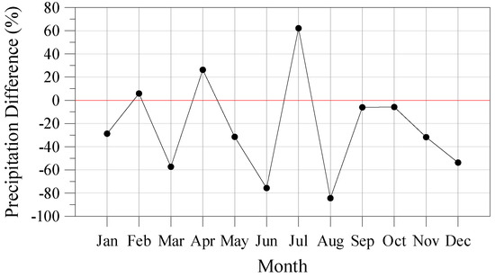 Figure 5 shows the % differences in the monthly average values of precipitation between the indicative future and the indicative reference year. Nine differences were negative, a fact that shows that the mean precipitation during these nine months is expected to reduce during the future period compared to the reference period. The analysis of the differences of the 3 h precipitation values that were included in two indicative years revealed that 37% of them were positive, 14% of them equaled zero, while the rest, 49%, was negative. Overall, the average of the values of precipitation that were included in the indicative future year was found to be 32% lower than the corresponding average for the indicative reference year.