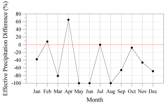 Figure 6 shows the % differences in the monthly average values of effective precipitation between the indicative future and the indicative reference year. Nine differences were negative, a fact that shows that the mean effective precipitation during these nine months is expected to reduce during the future period compared to the reference period. No effective precipitation was simulated for July of both the indicative future and the indicative reference year. Irrigation water needs are expected to rise during May, June, and August in the future, as no effective precipitation was simulated for May, June, and August of the indicative future year, although effective precipitation was simulated for these months of the indicative reference year. Overall, the average of the values of effective precipitation that were included in the indicative future year was found to be 45% lower than the corresponding average for the indicative reference year.