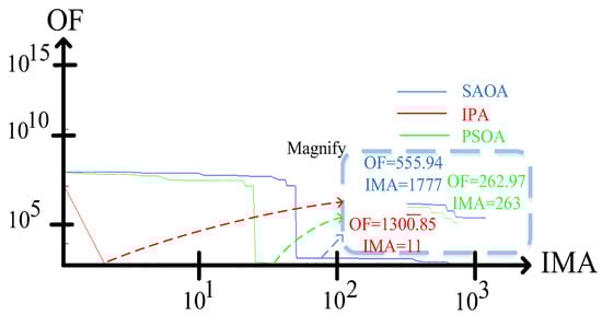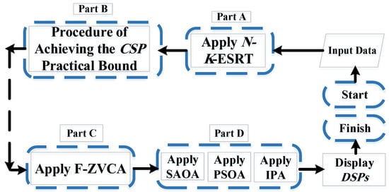 After the N-K-ESRT and F-ZVCA reduce the dimensions of the POSP, the DPSs are produced employing three MOAs, encompassing IPA, SAOA, and PSOA. The IPA handles both vastness and spread as well as smallness and concentration problems and may be retrieved from either NaN or Inf results [48]. Besides, SAOA is a technique for answering both constrained and unconstrained optimization issues. Accepting poorer solutions throughout the optimization procedure while retaining the ability to escape local points is a distinguishing feature of SAOA [22]. On the other hand, PSOA is highly valuable for nonlinear programming problems and has the potential to substantially optimize local search. Refer to [22,48,49] for details on the IPA, SAOA, and PSOA, respectively.