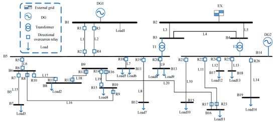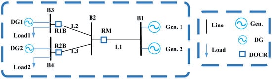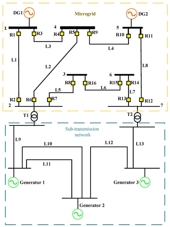 Generation, transmission, sub-transmission, and distribution networks are the four arms that constitute the whole electrical grid. The most critical and vital protective devices in distribution networks are overcurrent relays (OCRs) and DOCRs, which operate in the event of a fault. The fundamental task of protective relays is to quickly identify a permanent fault and transmit the tripping signal to the circuit breaker. The accurate setting of primary relays (main relays) is at the core of the fundamental architecture governing protective coordination, which is subsequently backed up by secondary relays (backup relays) at regular intervals. In traditional distribution networks, OCRs are the primary protection devices due to the radial orientation of the network’s current [1,2]. The conventional electrical distribution network has recently been transformed into a microgrid as a consequence of the penetration of distributed generation (DG) units [3,4]. This resulted in the conception of microgrids, in which DGs can feed the distribution network with or without a power grid link [5,6]. Due to the multiple orientations of electric current in microgrids, protection schemes are based on DOCRs [7,8]. The DOCR setting parameters (DSPs) contain the current setting parameter (CSP) and the time setting multiplier parameter (TSMP).