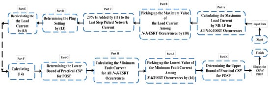 To facilitate the description of this section, Figure 2 serves as the sample network (as depicted in the N-K-ESRT section), and Figure 3 (consisting of parts A–K) provides the flowchart of PA-CSP-PB. The idea of this section is to acquire the CSP practical range of RM (shown in Figure 2) according to (6) and (7), which can be applied to the rest of the DOCRs. First, the maximum network current passing through the RM is used to determine the least bound of (7) for the RM. This is accomplished by employing the Newton–Raphson load flow (NR-LF) to compute the current flowing through L1 (seen in part A).