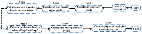 Step 5: Using the formula in (19), a fuzzy parameter denoted is derived by (20). Equation (19) signifies the average ratio between the fault current of the primary DOCR and their backup relays. is computed for any topologies coming from N-K-ESRT. In essence, (19) demonstrates that the fluctuations in the short-circuit level were significant for each topology; presumably, that topology should have a higher probability of being conveyed.