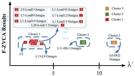 As observed in Figure 5, the IEEE Std. 399-1997 network is made up of 19 buses (B1, …, B19), 20 lines (L1, …, L20), 14 loads (Load1, …, Load14), 26 relays (R1, …, R26), and 1 external grid (EX). This industrial network is connected to the EX through two 69 KV/13.8 KV transformers (T1 and T2) [51]. In particular, this system is linked to two DG units with capacities of 15.6 MVA and 12.5 MVA for DG1 and DG2, respectively. This network is scheduled to contain 39 pieces of equipment for N-2 events (including all DGs, loads, lines, transformers, and Ex). There are 741 cases of N-2 events, according to (9). However, in accordance with Table 2, only eleven occurrences are investigated by N-K-ESRT, which reduces the size of the POSP by 98.651%. Due to the availability of 16 buses on the distribution part of the Example St. 399-1997 network, the N-K-ESRT ought to provide 32 cases based on (8). Due to the frequent bus-related events (illustrated in Table 2 in the EN row), the N-K-ESRT results are limited to 11 modes as opposed to 32 modes. Table 2 indicates that the voltage of fixed topology (VFT) for bus 5 is 0.99 PU. The VFT increases to the event voltage (EV) of 1 PU following the outages of L13-L9 (i.e., simultaneous outages for lines 13 and 9). In contrast, the VFT decreases to 0.94 PU as a result of the outages of lines 11 and DG1 (event name: EN). Notably, the aforementioned contingencies (L13 and L9 outages, L11 and DG1 outages) result in the lower (LB) and upper (UB) bounds of voltage ranges for bus 5 among all N-2 occurrences. After defining the chosen contingencies by N-K-ESRT, the F-ZVCA is utilized in order to group these contingencies. As a result of F-ZVCA, Figure 6 depicts the clustering of the N-2 contingencies into three clusters (Clusters 1–3). The maximum number of occurrences is allocated to cluster 1, which has nine topologies, indicating that these topologies are closer in terms of the short-circuit current based on (19). In addition, cluster 2 and cluster 3 only account for a single N-2 contingency, which includes L11-DG1 and L6-DG2 outages, respectively.