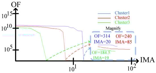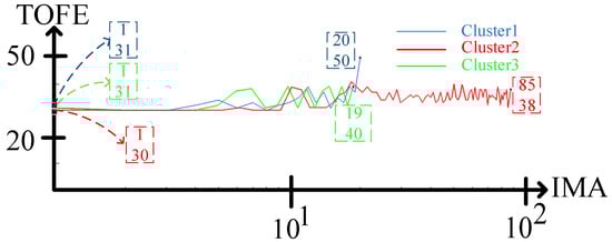 It is clear that cluster 1 has higher values for OF, O-TSMP, MTT, ATT, and ATTO than clusters 2 and 3. In light of this, the POSP is handled by the greatest number of topologies allocated to cluster 1 (seen in Figure 6), resulting in a more complex problem for cluster 1 than the other clusters. For extra information, POSP must be performed for each of the nine topologies assigned to cluster 1, and the aforesaid limitation must be met for all of them. In terms of short circuit level, the POSP of clusters 2 and 3 is much more relaxed than that of cluster 1. This advantage is exacerbated by the fact that clusters 2 and 3 cover just one of the N-2 outages, yielding the smallest influence on fluctuations in short-circuit current. Therefore, cluster 1 has the longest tripping time relative to the other clusters due to the fact that the fault current is inversely proportional to the DOCR’s tripping time based on (2). In addition, IPA’s METs for clusters 1, 2, and 3 are 1.8 s, 8.1 s, and 1.8 s, respectively. These MET are extremely fast computation times that are appropriate for solving the POSP. Moreover, the total objective function evaluation (TOFE) determined by IPA for clusters 1, 2, and 3 is 715, 3010, and 687, as displayed in Figure 8 and Table 4. The TOFE refers to the number of OF evaluations throughout each iteration. For deeper inquiry, and as seen in Figure 8, cluster 1 has 31 TOFE in the first iteration and 50 TOFE in the last iteration. It should be noted that the MET of cluster 2 is 4.5 times longer than those of clusters 1 and 3, culminating in the TOFE of cluster 2, which is much bigger than those of clusters 1 and 3.