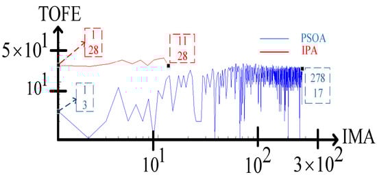 Consequently, it can be stated that the IPA and PSOA have been deemed the privileged MOAs for the TESKO2 feeder in terms of MET and ATTO, respectively (Figure 11 represents the TOFE of these algorithms). As shown in Figure 11, the TOFE values for IPA and PSOA are 378 and 3527, respectively. Given that PSOA’s MET is 23.18 times longer than IPA’s (mentioned in Table 5), the TOFE of PSOA is dramatically higher than that of IPA. Moreover, it can be pointed out that the TOFE of IPA acquired for the IEEE Std. 399-1997 system has a growing trend compared to the TESKO2 feeder, which is due to the fact that the IEEE Std. 399-1997 network is notably more looped than the TESKO2 grid. In looped systems, it is considerably more challenging to satisfy TSMP and coordination constraints than in radial networks. Because of this concern, IMA and MET rise significantly, forcing meshed networks to have a higher TOFE than radial networks.
