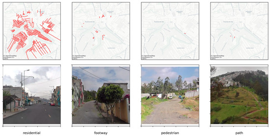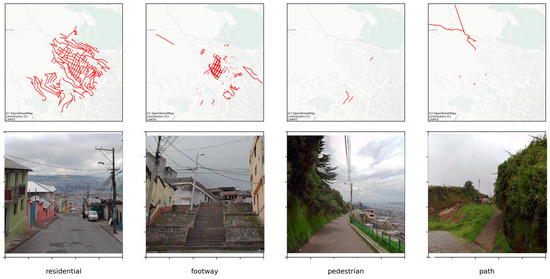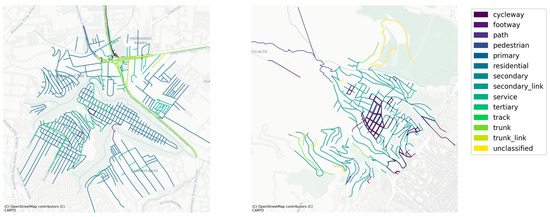 The condition of primary and secondary streets in La Bota and Toctiuco makes visible the accessibility and connectivity both within the respective neighborhoods and in their connection to surrounding areas, with a special focus on the quality of streets needed to reach UGS within each neighborhood. This analysis reveals information on the availability of public transportation, pedestrian and cycling infrastructure, and road conditions for the local population. To access this data, we used the Overpass API, which contains the following variables: type, geometry, alt name, highway, and name (Figure 5). The variable “highway” provides information on the type of road, which can be categorized as residential, service, footway, unclassified, track, path, or pedestrian.