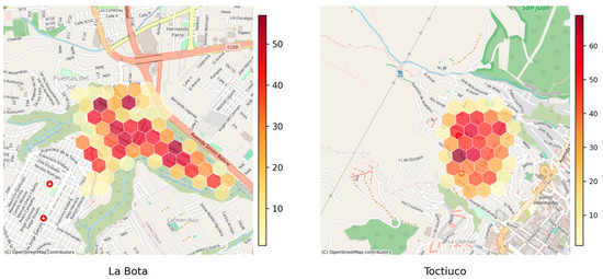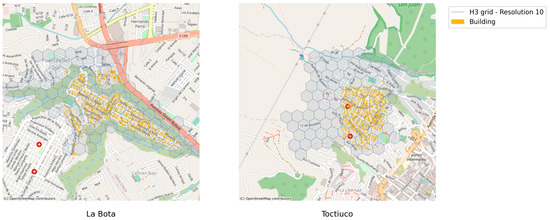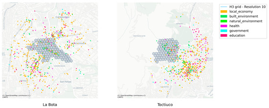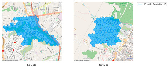 In this analysis, we integrated the H3 system for geospatial data analysis of the two neighborhoods (see Figure 9). It is important to emphasize that our use of the H3 system was not for spatial clustering. Instead, we employed it as a standardized method to aggregate and compare spatial information consistently across study areas. Thanks to the structured spatial indexing of H3, we achieved a consistent evaluation of the data at different scales and regions. For this study, we opted for a resolution of 10, which is equivalent to an area of 15,047.502 m2, or approximately 1.5 urban blocks. This resolution is the main parameter of our analysis and ensures both the accuracy and relevance of our results.
