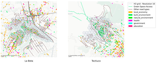 In order to obtain a more detailed context for La Bota and Toctiuco, we gathered information related to services and POIs throughout these two locations for their relevance. We initially used Open Street Maps (OSM), a collaborative open-source project that creates and provides free geospatial data. Anyone can contribute to OSM by adding, editing, and updating geographic information map [32]. The OSM community is responsible for maintaining and improving the data, resulting in a detailed and up-to-date geospatial dataset. OSM allows free access to its data and is based on the Open Database License (ODbL). This API provides data on points of interest (POIs) such as parks, schools, green areas, stores, hospitals, and bus stops. However, we found that OSM had limited mapped data in these two neighborhoods.