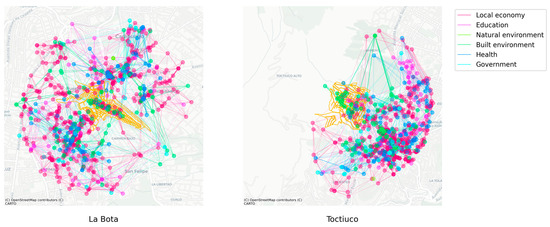 Together, these amenities deliver an informatic portrait of the services available, their total number, and the proximity they have in our case studies (Figure 3). In Toctiuco we identified 745 amenities and in La Bota 786 amenities (Table 3), with the following variables: business status, geometry, icon, icon background color, URL, name, opening hours, place ID, rating, reference, scope, types, user ratings total, vicinity, photos, and plus code.