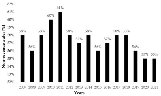 Water losses in the WUs of Kosovo are relatively high. The WUs, despite some of their commitments and limited support from projects financed by international donors, cannot solve the alarming water loss situation. On the contrary, the level of non-revenue water (NRW) has remained high. In some WUs, the situation has worsened, as shown in annual performance reports published by the Water Service Regulatory Authority [1]. For 15 years, NRW, expressed as a percentage of the whole sector, has stayed almost unchanged. It is at 55 to 61%, with small decreases and increases from year to year (Figure 1).