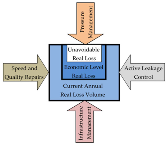 Pressure management is one of the quickest and most efficient ways to reduce physical water losses in high-pressure networks. It is one of four main methods to lessen physical water losses, as shown in Figure 5 [10]: