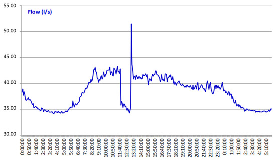 The flow profile established during measurements was used to conclude that the network in Gracanica functions in two regimes. A low-flow regime occurs from 00:00 to 07:55 and from 11:50 to 13:00, when the flow is lower than 40 [L/s] and varies in the range 34.13 [L/s]–39.77 [L/s] with Qaverage = 35.76 [L/s]. A high-flow regime occurs from 08:00 to 11:45 and from 13:05 to 23:50, when the flow is over 40 [L/s] and varies in the range 40.13 [L/s]–51.46 [L/s] with Qaverage = 41.26 [L/s].