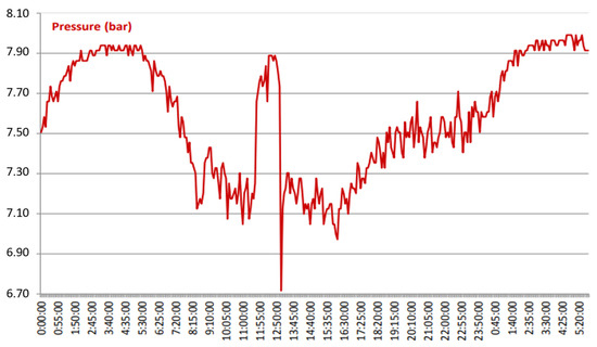 The registered values for the pressure in those 15 min are between 2.44 [bar] and 2.67 [bar], representing roughly a 4 [bar] pressure drop in the city network.