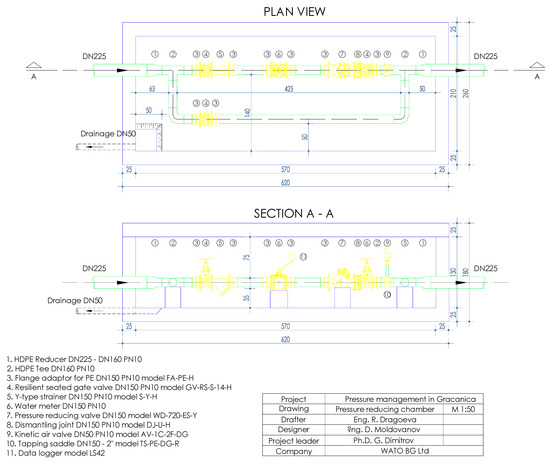 Based on the calculations performed for the research project, we chose a PRV DN150 with a Y-type body. The valve features a specific design, with the body and seat against cavitation; after PRV is provided, isolation-resilient seated gate valves are installed to ensure easy maintenance. after the reducing valve has been designed for the installation of a kinetic air valve, in order to protect the system from water column separation and vacuuming. Before PRV, a strainer and water meter are provided for installation. The water meter features a pulse output and is equipped with a data logger for the district monitoring of flow and pressure at the regulation point. Before subject PRV, the project design involves the construction of a bypass that will guarantee continuous water supply in case of valve maintenance. A detailed drawing of the installation scheme is shown in Figure 14.