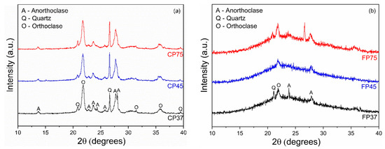 Figure 1a,b present the XRD patterns of CP and FP wastes in different particle sizes. The wastes exhibited crystalline phases of quartz (JCPDS 46-1045), anorthoclase (alkali feldspar, JCPDS 09-0478), and orthoclase (potassium feldspar, JCPDS 31-0966). These phases are related to the early formation of microcrystals during the ascent of magma toward the Earth’s surface [41,42]. Additionally, the presence of an amorphous halo is observed in the 2θ range between 20 to 30° (CP waste) and between 15 to 30° (FP waste), characteristic of perlite [43]. Similar findings have been documented in the existing literature [27,44,45].