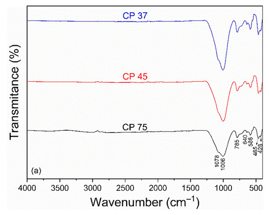The FTIR spectra of the samples CP and FP wastes in different particle sizes are shown in Figure 2a,b. For CP waste (Figure 2a), bands at 1078 and 640 cm–1 were observed, related to the asymmetric stretching vibration of the Si-O-Si group [46]. The band at 785 cm–1 was attributed to the symmetric stretching vibration of the Si-O-Si group, characteristic of amorphous silicates [47]. Bands at 1006 and 586 cm–1 were associated with the stretching vibration of the Si-O-Al group [46]. Bands located at 465 and 428 cm–1 corresponded to the stretching of the O-Si-O and Si-O groups, respectively [48].