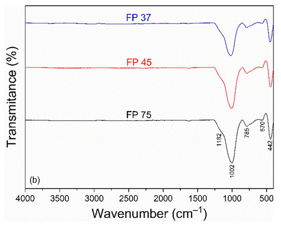 The spectrum of FP waste (Figure 2b) reveals the disappearance of bands at 640, 586, and 465 cm–1. The remaining bands were slightly shifted, appearing at 1182, 1002, 570, and 442 cm–1. The observed modifications are linked to the condensation process of silanol groups during to the thermal treatment to produce expanded perlite [49]. It is worth noting that the different particle sizes resulted in slight changes in the FTIR spectra, which were reflected in the intensities of the bands. The spectra of FP showed bands with lower intensities compared to the bands in the CP spectra. The researchers Udvardi et al. [50] noticed this trend during their analysis of the impact of particle size on monomineralic powders utilizing FTIR.