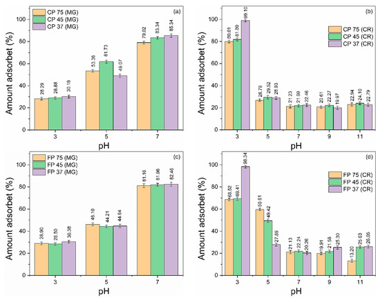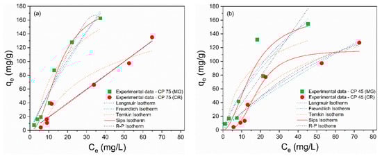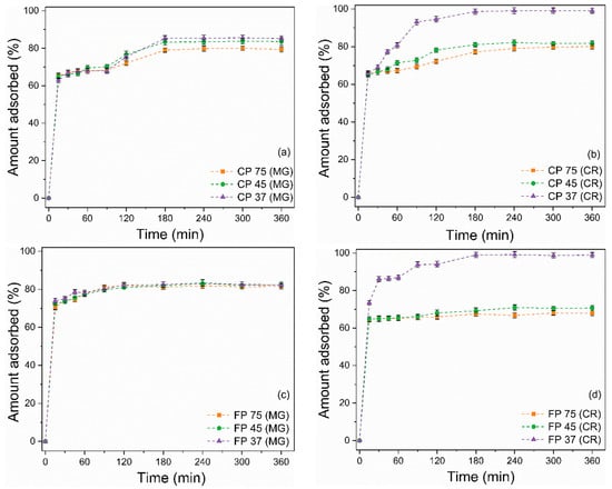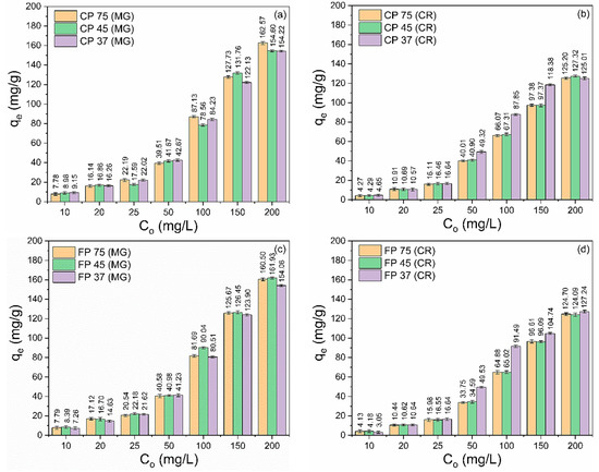 For MG adsorption (Figure 4a,c), the values of the maximum adsorption capacity followed the order: CP 75 (162.57 mg/g) > FP 45 (161.93 mg/g) > FP 75 (160.50 mg/g) > CP 45 (154.60 mg/g) > CP 37 (154.22 mg/g) > FP 37 (154.06 mg/g). On the other hand, for CR adsorption (Figure 4b,d), the values of the maximum adsorption capacity were CP 45 (127.32 mg/g) > FP 75 (127.24 mg/g) > CP 75 (125.20 mg/g) > CP 37 (125.01 mg/g) > FP 45 (124.69 mg/g) > FP 37 (124.09 mg/g).