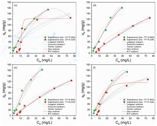 Nonlinear isothermal models (Langmuir, Freundlich, Temkin, Sips, and R–P) of MG and CR for (a) CP 75, (b) CP 45, (c) CP 37, (d) FP 75, (e) FP 45, and (f) FP 37.