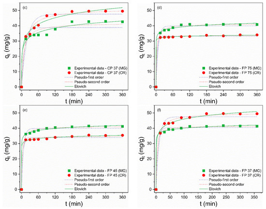 Nonlinear curves of the pseudo-first order, pseudo-second-order, and Elovich adsorption kinetic models of MG and CR dyes for (a) CP 75, (b) CP 45, (c) CP 37, (d) FP 75, (e) FP 45 and (f) FP 37.