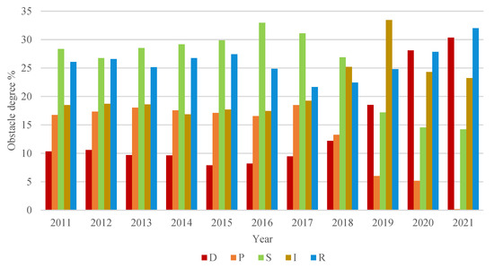 - The main obstacle factors were not fixed in different years. From 2011 to 2016, some indicators characterizing the ecological and environmental conditions became the main obstacle factors for the development of China’s EPVR. From 2019 to 2021, the indicators concerning the population, society, and industrial development conditions became the new main obstacle factors. In terms of subsystems, the obstacle degree of the Pressure subsystem to the whole system decreased, while the Influence subsystem gradually increased and the rest of the subsystems showed fluctuations.