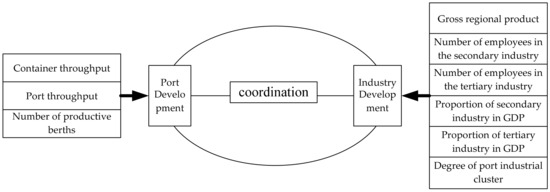 The index of the coordination of the port–industry composite system is the key parameter to accurately measure the degree of synergy. The indices selected should fully reflect the degree of synergy in the development of inland ports and industries along the Yangtze River, while avoiding information redundancy as much as possible. Previous studies evaluating the level of collaborative development of port–industry coupling synergy used different evaluation indicators due to differences in the perspectives of the researchers and the availability of specific data. However, a summary of the research of existing scholars shows that the selection of indicators in previous studies has been concentrated in the following aspects: from the perspective of port development, cargo throughput, productive berths, and container cargo throughput have been the most important; from the perspective of industrial development, regional GDP, the level of industrial agglomeration near ports, the proportion of the secondary industry in GDP, and the proportion of the tertiary industry in GDP have been the most important.
