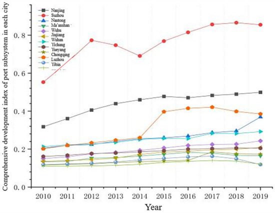 (1) The comprehensive development index of ports in Suzhou, Nanjing, and Chongqing demonstrated a relatively high level from 2010 to 2019. However, with the passage of time, the comprehensive development index in the above cities fluctuated greatly, while the same index of other provinces and cities remained relatively stable. From the perspective of industrial development, Suzhou and Chongqing demonstrated the highest comprehensive industrial development index between 2010 and 2019, with that of Chongqing showing the most obvious fluctuation in its industrial system, that of Luzhou and Yibin remaining at the lowest level, and that of other cities remaining relatively stable.