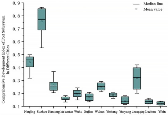 In terms of port development, the comprehensive development index of ports in Suzhou, Nanjing, and Chongqing from 2010 to 2019 was relatively high, among which that of Suzhou was the highest (see Figure 3). Suzhou Port has excellent Yangtze River port line resources, smooth and fast land and water collection and distribution channels, unique geographical advantages, and an economically developed port hinterland. It is the largest inland port in the world in terms of cargo throughput and container throughput, and it is one of the nine main trunk ports in mainland China. Its comprehensive development strength far surpasses that of other inland ports in the Yangtze River Economic Belt. The Port of Nanjing is a hub port of land and water transport and river–sea transit in the Yangtze River Basin. It is an international, multifunctional, and comprehensive river–sea transport main hub port with strong comprehensive development strength. With the passage of time, the comprehensive development index of Suzhou has fluctuated dramatically (see Figure 4), and it is followed by Nanjing, with that of Yibin showing the minimum fluctuation. After 2016, the same index declined, while the comprehensive development index of ports in other provinces and cities fluctuated slowly and remained relatively stable. This is because Suzhou Port, an international port, is greatly affected by the international situation. In 2013, the slow recovery of foreign demand, domestic overcapacity, and prominent structural contradictions brought about the pressure of economic slowdown that affected Suzhou Port. In 2015, Suzhou took the initiative to adapt to the new normal of economic development by focusing on the general requirements of “five steps to a new level” and “strong, rich, beautiful and high”. With the focus on improving the quality and efficiency of economic development, the city’s economy has been stable on the whole, and the comprehensive strength of the port has reached a new level by coordinating various works, such as stabilizing growth, promoting reform, adjusting structure, strengthening ecology, benefiting people’s livelihoods, and preventing risks.