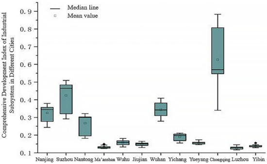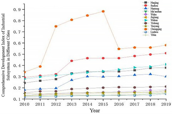 In terms of industrial development, Suzhou and Chongqing enjoyed the highest comprehensive industrial development index from 2010 to 2019. However, a dramatic fluctuation was observed in the industrial system of Chongqing. Before 2016, the industrial index of Chongqing was relatively unstable, with a significant decrease in 2016. However, the industrial system of Chongqing still remained at a relatively high level, followed by Nanjing. At the same time, the comprehensive industrial development index of Luzhou and Yibin was relatively low, while that of other cities remained stable.