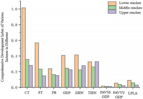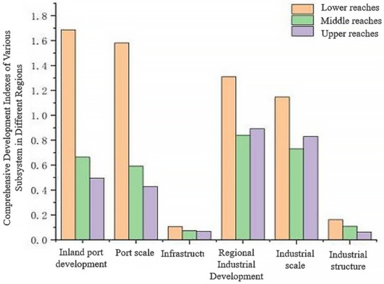 To summarize, the port development level of the middle reaches of the Yangtze River was higher than that that of the upper reaches, while the industrial development level of the upper reaches of the Yangtze River was higher than that of the middle reaches, and the port development level of the lower reaches of the Yangtze River performed the best.