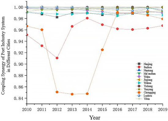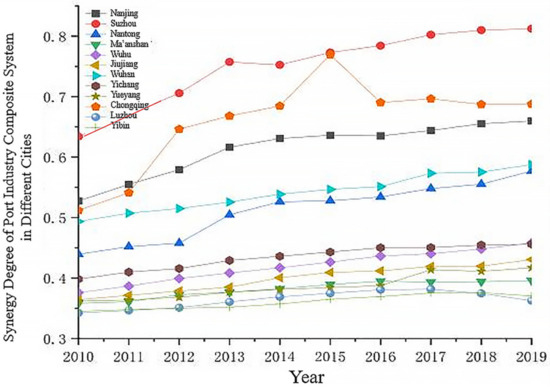 According to the judgment criteria of the degree of synergy (see Table 5), the level of collaborative development between inland ports and industries along the Yangtze River can be determined, as can be seen in Table 6. From 2010 to 2019, the synergy degree of Suzhou, Chongqing, Nanjing, and Wuhan was higher, all exceeding 0.5, while the Hong-Kong-produced systems promoted one another at a high level. From 2010 to 2019, most of the synergistic development between Hong Kong and industry in Suzhou was at a moderate level, and it reached a high-quality level in 2018, because Suzhou has continuously promoted the construction of industrial innovation clusters in recent years, and the output value of the four major industrial innovation clusters in the city—namely, electronic information, equipment manufacturing, biomedicine, and advanced materials—has been rising. At the same time, headquarters and R&D foreign investment projects continue to settle in Suzhou, the foreign economic level continues to improve, and the level of coordinated development of Hong Kong and industry continues to improve. The degree of port–industry coordination in other cities is low, and most of them are at a good level or below, indicating that there is a lot of room for improving the level of coordinated development of inland ports and industries along the Yangtze River. With the exceptions of Luzhou and Yibin, which showed a downward trend in 2016, the degree of synergy between ports and industries in other cities has increased year by year. This is because the development of inland ports provides the basis for the efficient operation of the industry, and the continuous upgrading and adjustment of the industry will, in turn, affect the development of inland ports. Industrial development not only provides supplies for the operation of inland ports but also meets their development needs. It also puts forward new requirements for the development of inland ports to further promote their high-quality development [31]. With the continuous economic development of inland port cities along the Yangtze River in the past 10 years, the mutual influence between inland ports and industries has gradually deepened, and the level of collaborative development has also steadily improved. Maanshan in the lower reaches of the Yangtze River was mildly disordered from 2010 to 2019, Wuhu was mildly disordered from 2010 to 2012, and the level of coordination between Hong Kong and industry showed good coordination after 2012. Jiujiang in the middle reaches of the Yangtze River was mildly disordered from 2010 to 2013, after which it gradually formed good coordination. In the upper reaches of the Yangtze River, except for the cities of Chongqing, Yibin, and Luzhou, the degree of coordination between Hong Kong and production was mildly disordered from 2010 to 2019. This shows that the development cooperation between these inland ports and industries is not perfect, and that inland ports and industries need to develop together, influence one another, cooperate with one another, and deeply integrate to achieve common development. The first step should be to increase foreign exchanges and communication, promote the flow of technology, information, and economy between regions, promote the development of an export-oriented economy, and then enhance the industry’s dependence on inland ports, bring sufficient supply of goods to inland ports, put forward new requirements for inland ports, and further promote the high-quality development of inland ports. The second step should be to continuously improve the collection and distribution capacity of inland ports, expand the market scope, enhance regional industrial competitiveness, expand the regional industrial scale, drive the development of related modern service industries, optimize the industrial structure, and promote the transformation and upgrading of relevant enterprises. The third step should be to promote the development of industries related to inland ports, promote the development of high-tech industries, intensify the industrial agglomeration of ports, and drive the development of related modern service industries. The above three points can enhance the dependence between inland ports and industries, and they can improve the level of coordinated development of inland ports and industries along the Yangtze River (see Figure 10 and Figure 11).