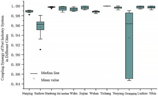 From 2012 to 2014, although the port industry in Chongqing played a smaller role than that in other cities, showing a disorderly development, it still remained over 85%. After 2016, the figure increased steadily. The coupling degree of 12 inland ports and industries along the Yangtze River was relatively high, indicating a relatively sound synergy of inland ports and industries (see Figure 8 and Figure 9).