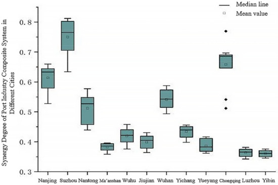 As stipulated in the Inland Shipping Development Outline issued by the Ministry of Transport of the People’s Republic of China in May 2020, it is necessary to strengthen the effective connections between ports and urban and rural construction, along with the industrial development layout, and to promote the coupling synergy development of ports, industries, and cities. At the same time, with the continuous deepening of the integration of cities clustered along the Yangtze River Economic Belt into the “Belt and Road” Initiative, ports, as an important gateway for the opening up of the region, are exerting a more and more far-reaching impact on the inland industrial cluster [1]. From the above, we can see that the coupling synergy development of ports and industries has been an important means of supporting balanced regional development. Therefore, based on the entropy weight TOPSIS method, this paper evaluates the degree of coupling cooperation between inland ports and industries along the Yangtze River. Firstly, this paper is intended to objectively reflect the evolution and development direction of the ports and industries from the perspective of the port–industry system, and to establish a comprehensive competitiveness evaluation model and a coupling synergy model of the port using the entropy weight TOPSIS method. Then, the degrees of coupling synergy of inland ports and industries along the Yangtze River will be evaluated. Finally, corresponding conclusions will be drawn from the perspectives of port cities and industries.