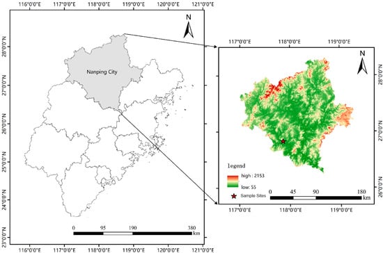 Nanping City is located in the northern part of Fujian Province (Figure 1), with relatively high terrain (117°00′–119°25′ E, 26°30′–28°20′ N), with an average annual temperature of about 17–21 °C. The summer is hot, with the highest temperature reaching over 30 °C, and the winter is cooler, with an annual average precipitation of 1000–2000 mm, which is typical of a monsoon climate.