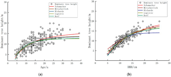 Fitting results of the guide curves: (a) stand height−age orientation curves; (b) stand height–DBH orientation curves.