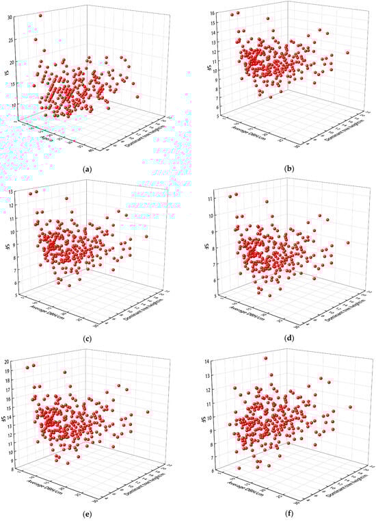 The SF of fir can be calculated in accordance with Equation (4), and the frequency statistics of SF are shown in Table 11. The nine types of site form within the fir subdivision of Nanping City, have indices ranging from 6 to 14. There was an uneven distribution of the number of fir trees within the different site forms; the number of site forms in 8, 9, 10, and 11 was higher, accounting for 0.91 of the totals, and the number of other site forms was lower. In view of the fact that the accuracy of the final classification model will be affected by the numerous standings, the sites in this study were classified into three categories based on the frequency distribution of the site in the data: 11–14 as Class I with a frequency of 52, which is an excellent site quality class; 9–10 as Class II with a frequency of 170, which is a medium-standing quality class; and 6–8 as Class III with a frequency of 42, which is considered a poor-quality site class.