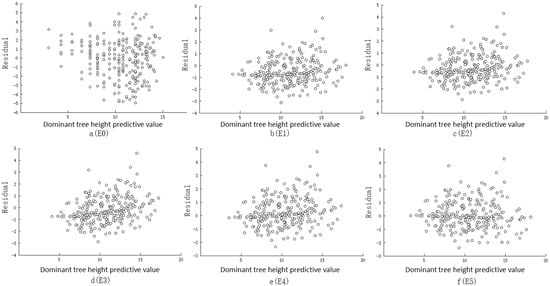 The residuals of the site index model (E0) and the site form model (E1, E2, E3, E4, E5) with predicted values of dominant tree height are shown in Figure 6. The values of parameter b were substituted into Equations (1) and (2), respectively, to obtain the site index and site form for each sample site. The R2, RMSE, and MAE of the results of the site index and site form models were then compared, and residual analysis was performed on both. The results showed that all five site form models outperform the site index model. The partial correlation coefficients of site form, site index, and stand volume were analyzed using SPSS 25.0 software, controlling for constant age and density, and the results are shown in Table 10. The results showed that site form, site index, and stand volume were all significantly and positively correlated, and the bias correlation between site form and stand volume was greater than that between site index and stand volume.