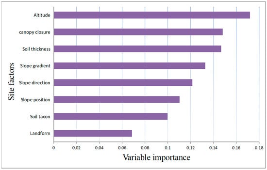With regard to the weight of the influence of the site factor characteristic variables on the site form, this study uses the relative importance of the variables for description. Figure 7 shows that among the eight site factors, altitude and canopy closure had the greatest effect on fir growth, respectively, followed by soil thickness, slope gradient, slope direction, slope position and soil taxon. The factor with the least effect on the growth of fir was landform.