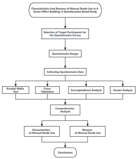 The study is a questionnaire-based research. Firstly, it is necessary to choose the target participants for the questionnaire survey. We selected a three-star certified green office building in Ningbo, where the occupants include professionals from the construction industry and those from other industries. Based on the survey subjects and the objective environment of the office building, the questionnaire was designed. During the preparation of the interviews and the questionnaire, questions were simplified and presented in a simple way to encourage people to participate. After collecting the questionnaire survey data, the data was analyzed in various ways, such as cross-tabulation, correspondence analysis, and cluster analysis. Lastly, analyze the characteristics and reasons for manual shade use and draw conclusions. The roadmap is depicted in Figure 2.