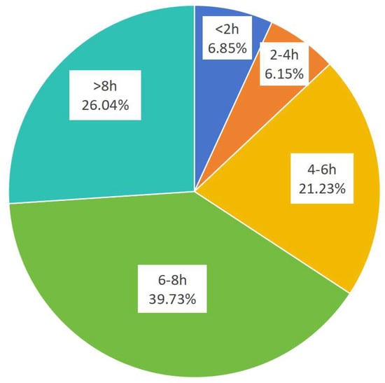 A total of 146 occupants participated in the questionnaire survey, of which 79 (54.11%) were female and 67 (45.89%) were male. A total of 82 occupants (56.16%) work in south-facing offices, 35 in north-facing offices and 16 and 13 occupants in east- and west-facing rooms. The low percentage of occupants in east and west rooms is mainly due to the fact that the long axis of most office buildings is facing south, with most rooms in south and north directions. Most occupants (65.76% see Figure 3) work for more than 6 h in the office space and 21.23% for 4–6 h. Only about 13% of occupants stay in office space for less than 4 h. Shared office spaces are more popular in this region, with 78.08% occupants in shared spaces and 21.92% in private spaces. About half of the occupants (51.35%) are less than 30 years old, 44% of the occupants are between 30 and 50 and only less than 5% of occupants are over 50.