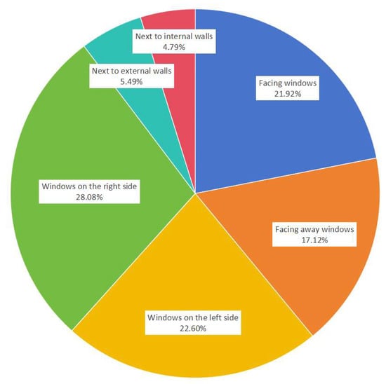 Regarding the seating position (see Figure 4), about half of the occupants sit next to windows (windows on the left/right side), and 21.92% of the occupants face windows. The remaining three parts (face away windows, next to external walls or internal walls) account for 27.39%. The seating position relative to the window impacts the occupants’ satisfaction, as can be seen in Figure 5.