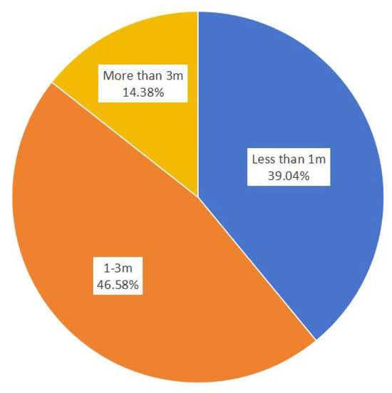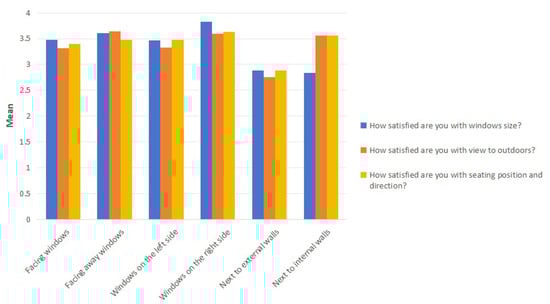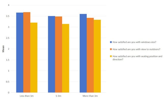 Most seating positions result in an average level that approaches satisfaction (corresponding to Likert scale 4), except for sitting next to external walls where occupants experienced the lowest satisfaction level. An interesting finding is that seating positions next to internal walls have almost the same level of satisfaction. For the distance from seating position to the window (see Figure 6), 39.04% of occupants sit next to windows (<1 m), 46.58% sit near windows (1–3 m) and 14.38% sit away from windows (>3 m). The distance to windows has little influence on the occupants’ satisfaction (see Figure 7), with view and seating position having a little improvement in the satisfaction levels of occupant next to windows.