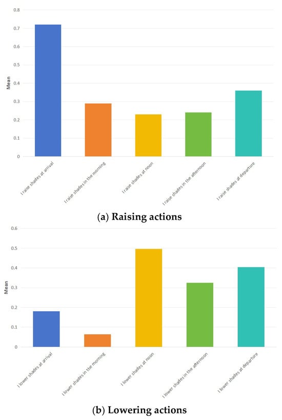 - Most shade raise occurs upon arrival and in the morning and most shade-lowering actions appear at noon and in the afternoon. This trend is similar among different orientations. Two and six clusters were revealed by clustering, respectively, for the time of raising and lowering actions. Regarding the relationship between raising and lowering time, three behavior patterns were identified by correspondence analysis.