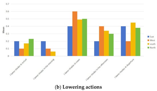 It can be seen from Figure 8 that the time for occupants to raise and lower shades is significantly different. Most shade raise occurs upon arrival and in the morning and most shade-lowering actions appear at noon and in the afternoon. This trend is similar among different orientations (see Figure 9). Therefore, there is a significant difference in the time of shade raise and lowering actions and the modeling of shade actions needs to consider this difference.