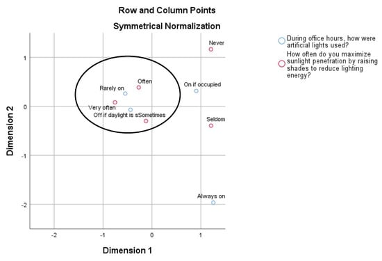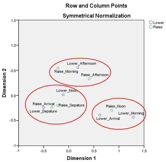 To better understand the potential relationship between shade actions, correspondence analysis was conducted. The results show the first two dimensions account for 89.5% of inertia (dimension 1 accounts for 68.3% and dimension 2 accounts for 21.2%), and thus, these two dimensions were kept based on the criteria of the percentage of explained variance over 70%, and the percentage of explained variance by each dimension over 20% []. Dimensions 1 and 2 are presented in the horizontal and vertical axis in Figure 10, respectively, and the association of column and row points by a correspondence map is illustrated graphically to help visualize the relationship between the two variables (time of raising and lowering action). It shows that three behavior patterns can be grouped with the first group of occupants raising shades upon arrival or in the morning and lower shades in the afternoon. The second group tends to lower shades upon arrival or in the morning and raise them at noon. The last group tends to raise shades upon arrival and lower them at noon or departure, and sometimes raise them at departure.